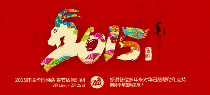 蚌埠華迅網絡科技有限公司2015新年放假時間為2015年2月16日至2月25日,假日期間如有需求請聯(lián)系:0552-3711772 15255232273