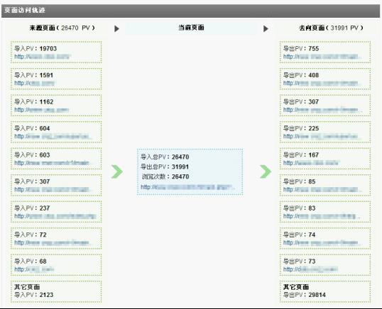 訪客經(jīng)常在網(wǎng)站中的各個(gè)頁(yè)面之間跳轉(zhuǎn),訪問的路徑不勝枚舉,但可以通過觀察焦點(diǎn)頁(yè)面及其上下游頁(yè)面,掌握訪客的來路和去向,發(fā)現(xiàn)較普遍的訪客訪問習(xí)慣。頁(yè)面訪問軌跡即用來完成該功能,用戶可自由指定觀察焦點(diǎn)頁(yè)面,系統(tǒng)會(huì)列出該頁(yè)面的前十位來路頁(yè)面和去向頁(yè)面。對(duì)觀察焦點(diǎn)頁(yè)面而言,其自身的導(dǎo)入、導(dǎo)出PV的多少能夠反映出該頁(yè)面在網(wǎng)站的權(quán)重地位,而通過觀察來源和去向頁(yè)面又能最大限度的了解到訪客的行為習(xí)慣及興趣點(diǎn)。