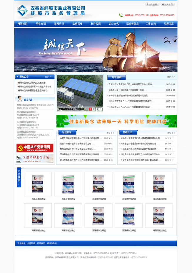 多年來,蚌埠鹽業(yè)認真貫徹落實國家《食鹽專營辦法》、《食鹽加碘消除碘缺乏危害管理條例》,始終以食鹽市場安全穩(wěn)定為天職,忠實履職,恪盡職守。一方面對全市鹽業(yè)市場進行鹽政監(jiān)管,嚴(yán)厲打擊鹽業(yè)違法犯罪,全力維護食鹽市場安全穩(wěn)定;另一方面負責(zé)組織開展食鹽專營,致力為消費者提供安全、優(yōu)質(zhì)、放心的加碘食鹽,確保全市371萬人口的食鹽供應(yīng)。與此同時,蚌埠鹽業(yè)主動適應(yīng)市場需要,積極拓展非鹽經(jīng)營,在發(fā)展的道路上不斷深化改革,自主創(chuàng)新,產(chǎn)業(yè)結(jié)構(gòu)轉(zhuǎn)型邁出堅實步伐,全區(qū)總資產(chǎn)已近8000萬元,現(xiàn)有經(jīng)營倉儲面積約1.5萬平米,在建倉庫1萬余平米。2014年實現(xiàn)銷售收入14762.69萬元,其中食鹽銷售4967.40萬元,非鹽銷售9795.20萬元、實現(xiàn)利稅1124.52萬元,經(jīng)濟社會效益居全省同行領(lǐng)先。先后榮獲全省鹽業(yè)系統(tǒng)先進單位五連冠、安徽省勞動保障誠信示范企業(yè)、安徽省衛(wèi)生先進單位、檔案管理考核安徽省一級單位、蚌埠市A級納稅信用單位、蚌埠市第十四屆文明單位等多項榮譽稱號。